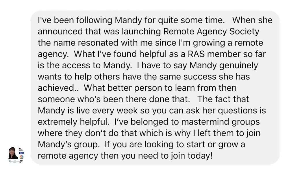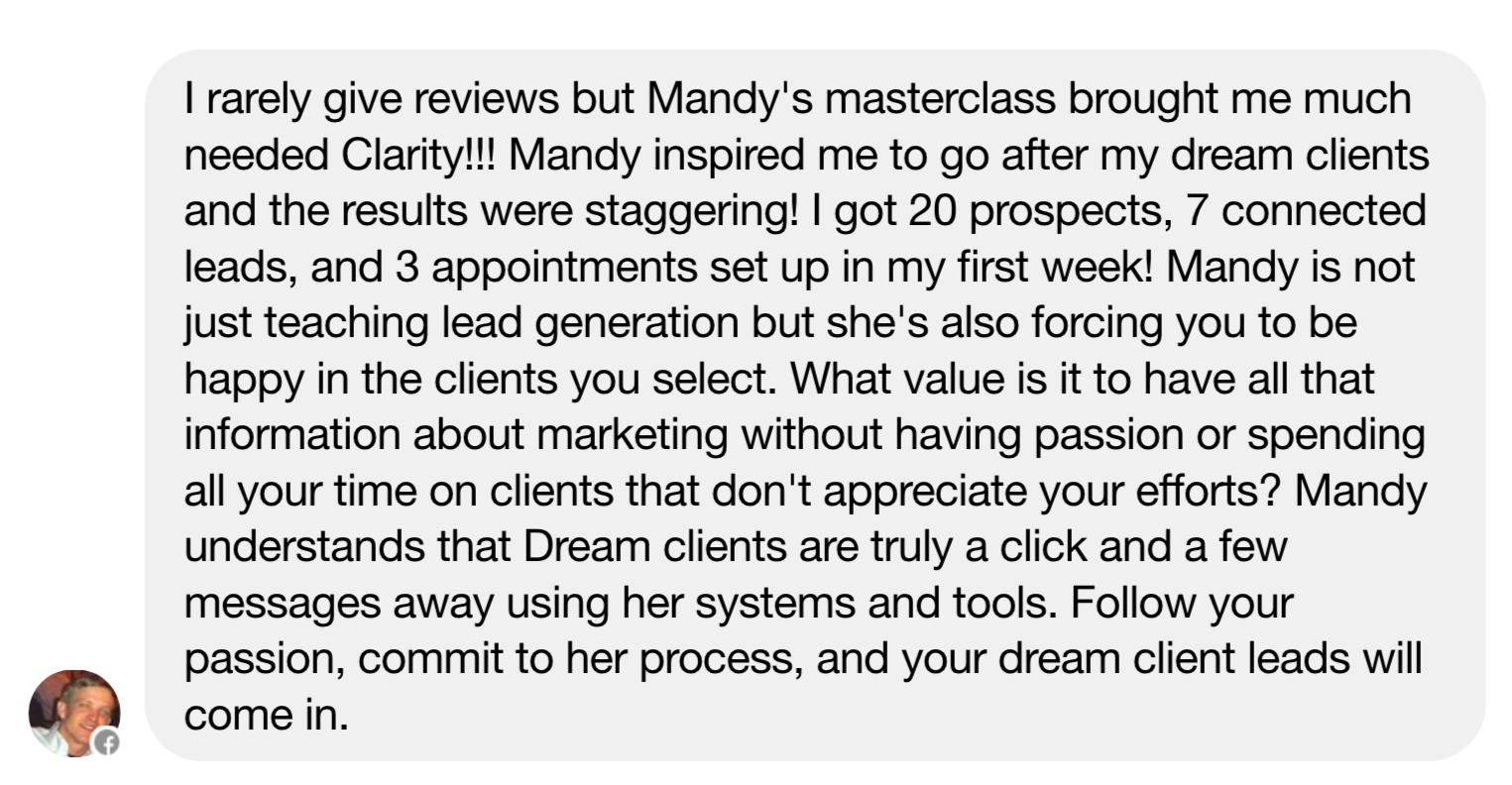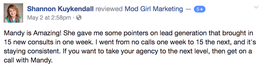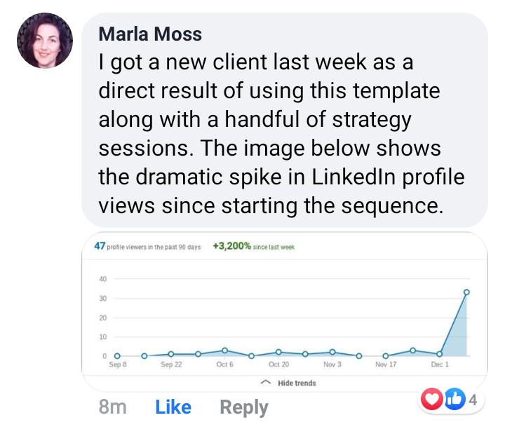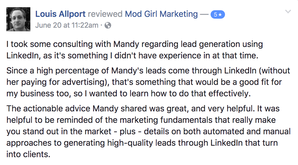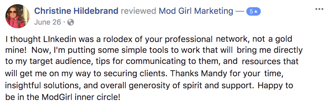 Problem: Carolyne had been struggling to tap into LinkedIn’s goldmine of leads for years. She said, "LinkedIn was a big, sort of mysterious black hole to me. I had a LinkedIn account for years and, like many people, did essentially nothing with it. I knew I needed to learn how to use it to my advantage, but felt intimidated by doing it, so, nothing happened. Then I found [Mod Girl's program] and everything changed."