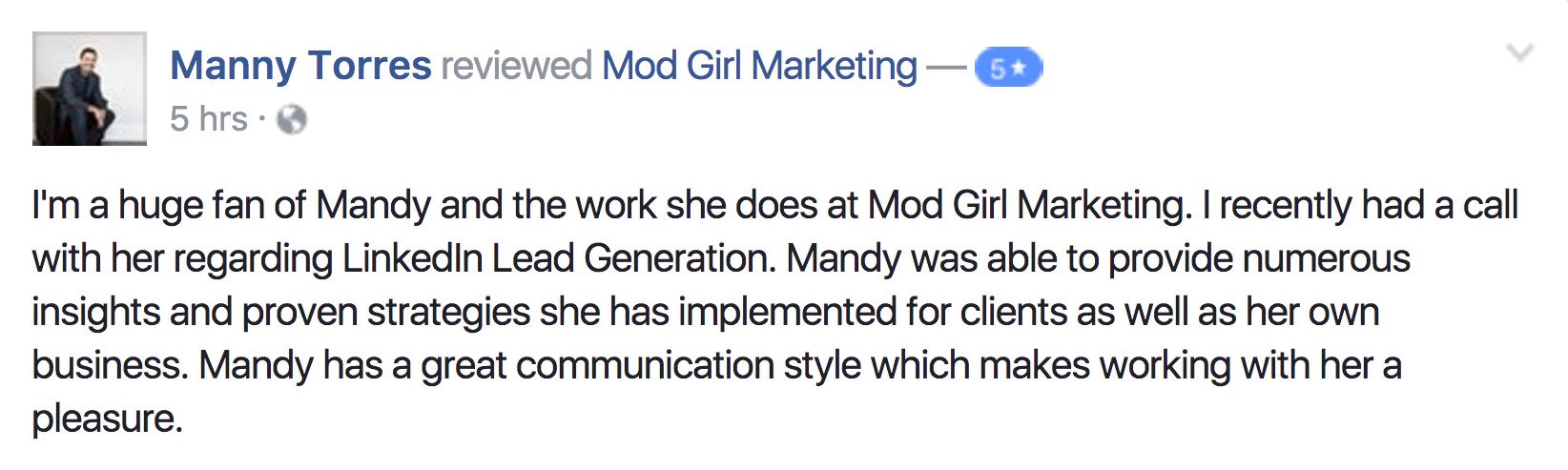 She has been marketing successful brands online since 2007. In 2010, she decided to utilize her online marketing skills to start a marketing agency, Mod Girl Marketing. Now, over a decade later, Mandy and her team at Mod Girl® partner with B2B companies to increase brand exposure and revenue through the power of LinkedIn and modern social media strategies.